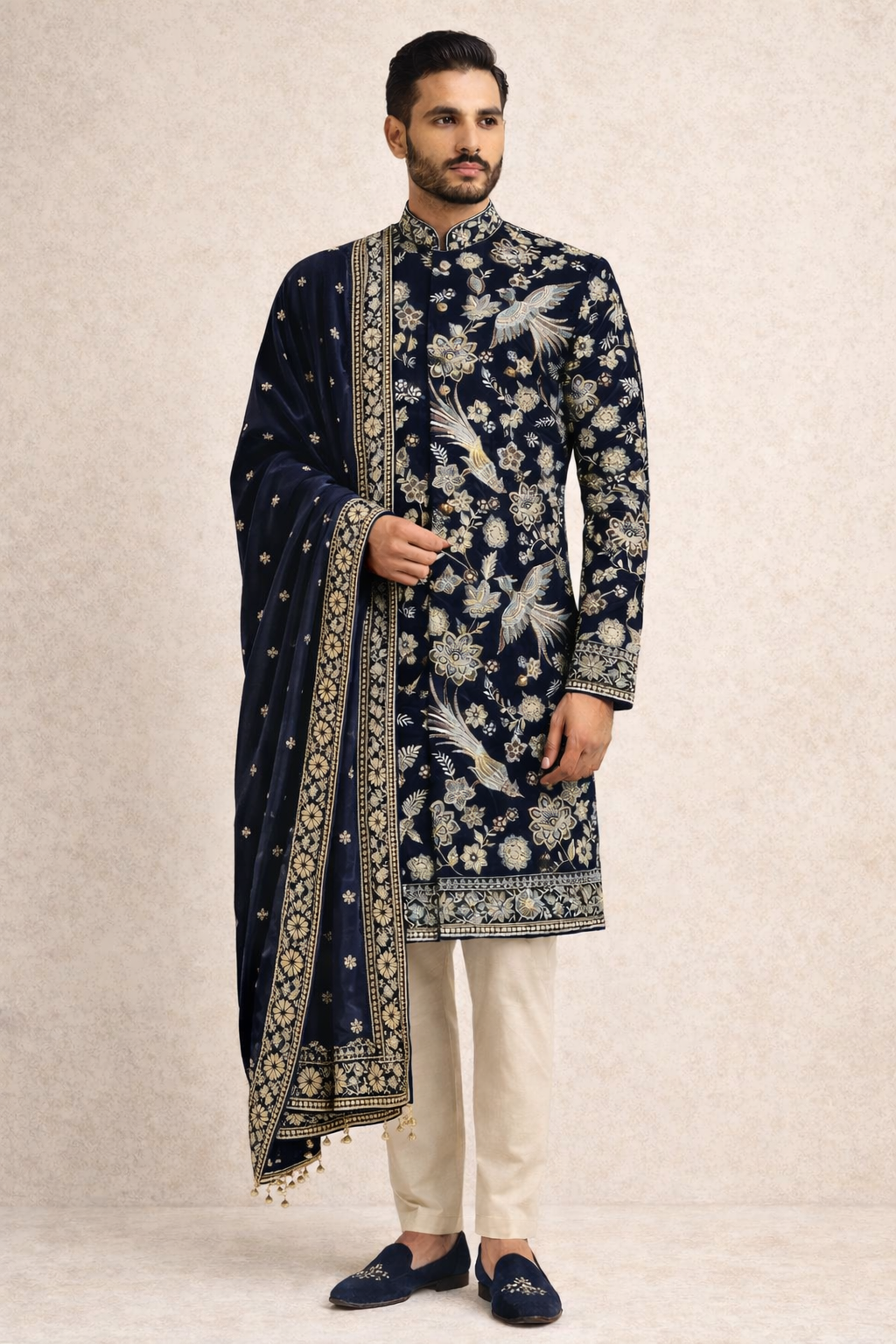 VELVET SHERWANI SET WITH HEAVY TRADITIONAL EMBROIDERY ALL OVER