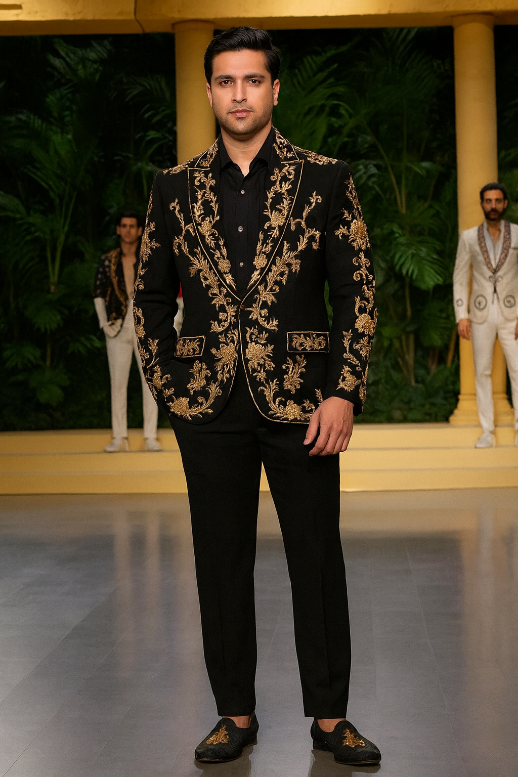 The Royal Black Blazer features Heavy Hand-Embroidered Golden motifs , structured Shoulders and a refined...