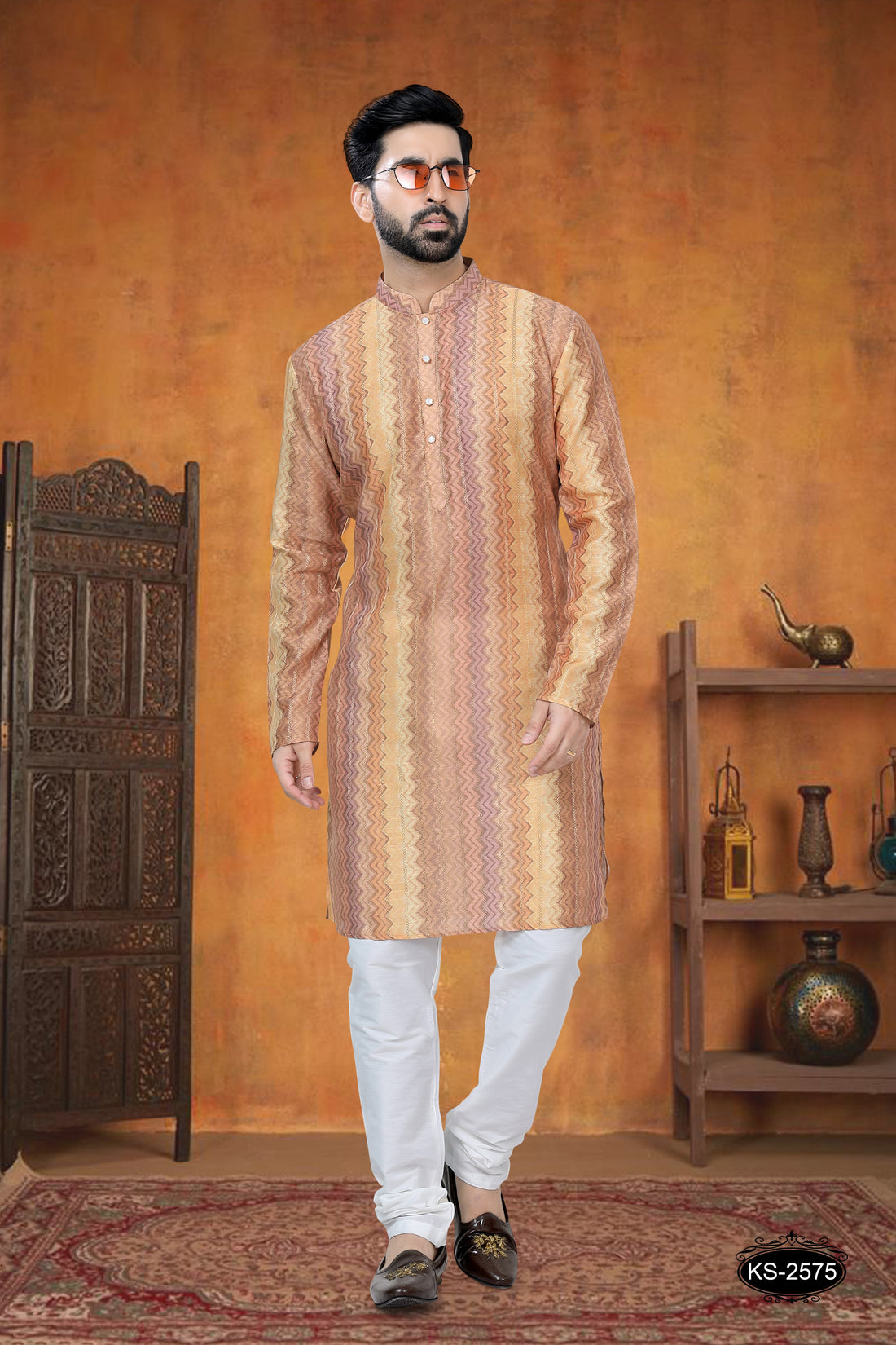 KURTA SET WITH SELF-DESIGN IN ORANGE & YELLOW TONE