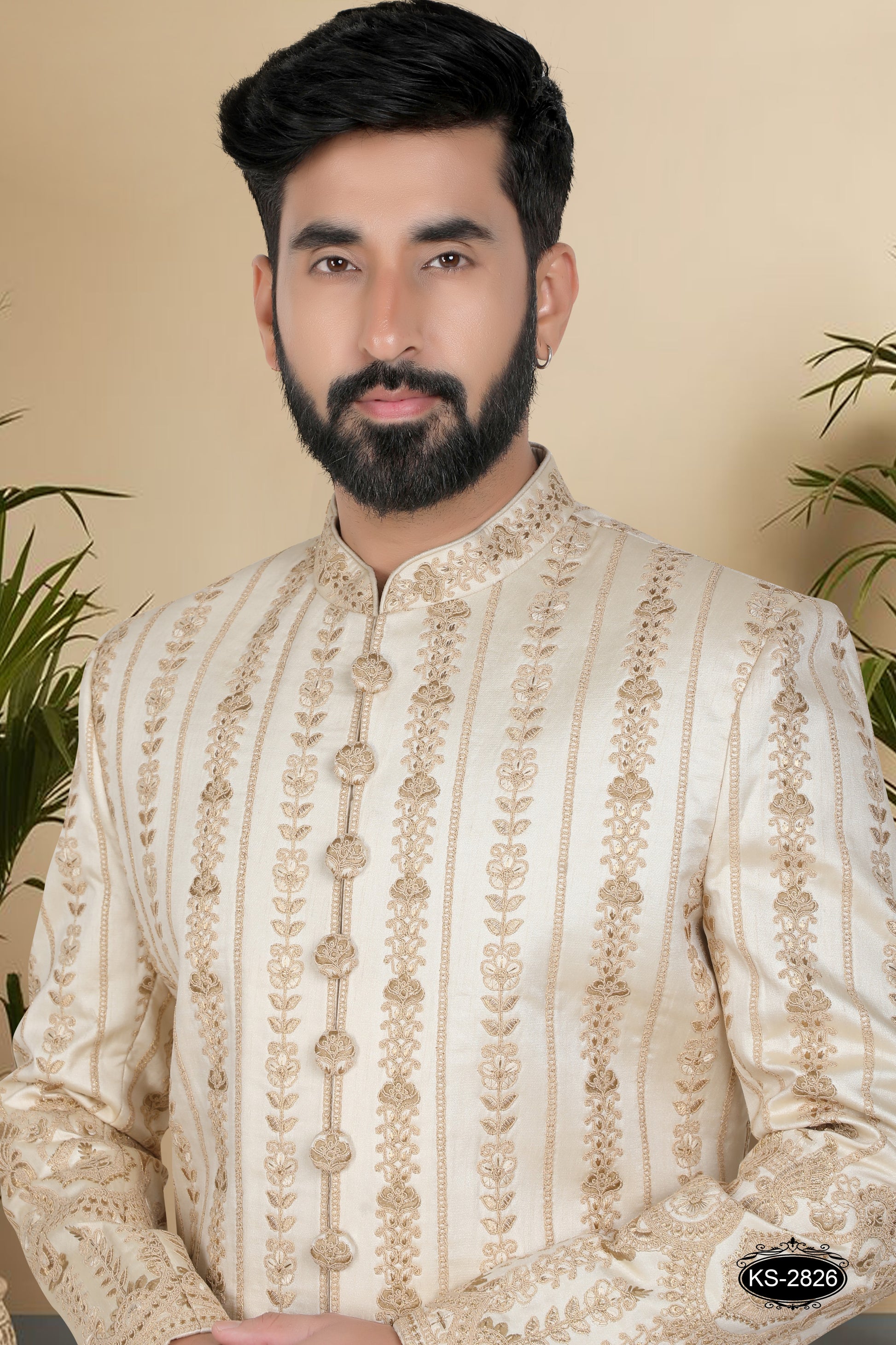 GOLD SHERWANI SET WITH HEAVY PANEL & THREAD EMBROIDERY ALL-OVER